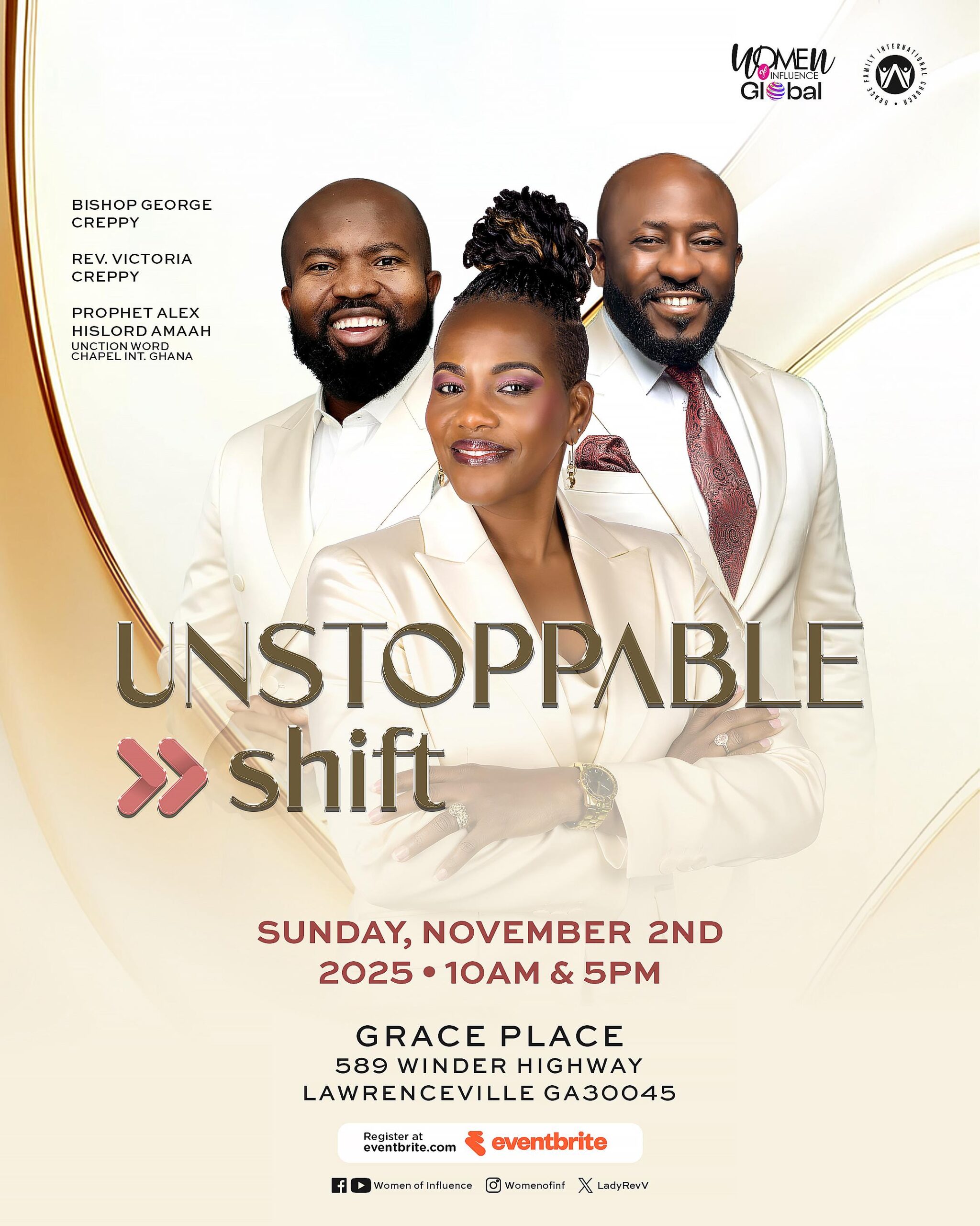 The Woman of Influence Conference 2025 returns with the theme “Unstoppable Shift – Where Women Rise, Shift, and Influence.” Join Rev. Mrs. Victoria Nana Aggrey Creppy from October 31 to November 2 at Grace Place, Lawrenceville, GA, for a weekend of prayer, worship, empowerment, and celebration designed to inspire, uplift, and ignite your divine purpose.